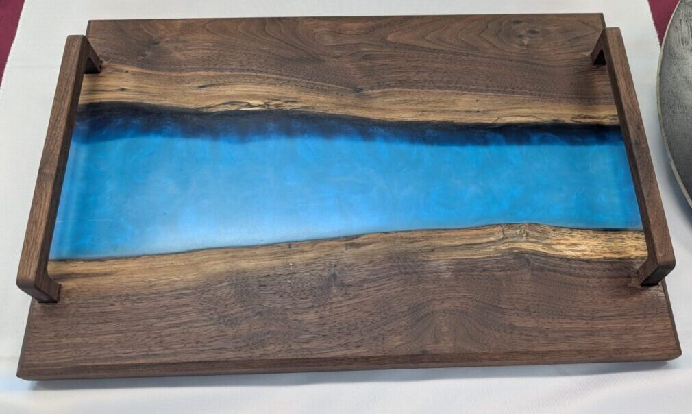 Presenting a one-of-a-kind handcrafted walnut river serving tray that marries the beauty of nature with the artistry of fine craftsmanship. Made from premium walnut, this tray showcases a live-edge design, enhanced by a striking, hand-poured epoxy river in a captivating shade of blue. The contrast between the natural wood grain and the rich epoxy is not just visually stunning—it’s a testament to hours of meticulous work, where each detail is crafted to perfection.